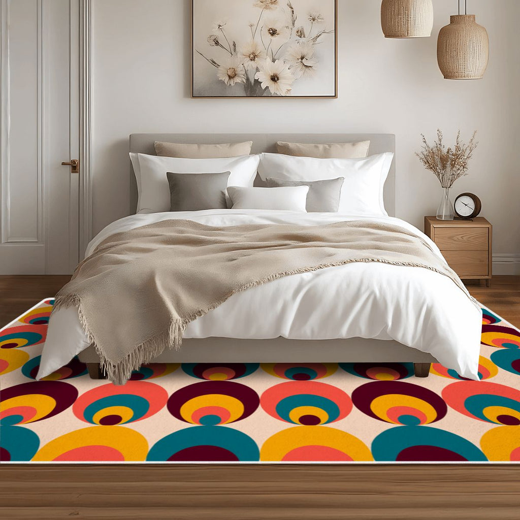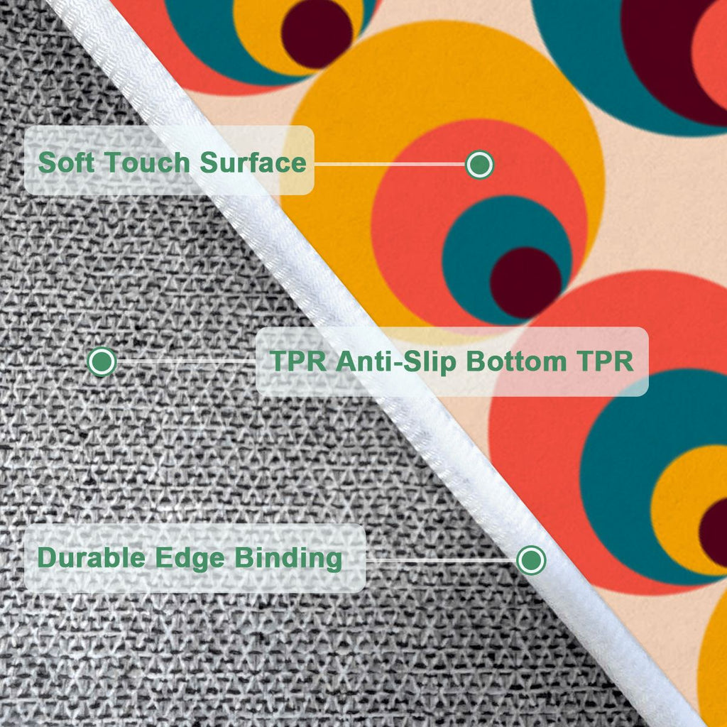 Add comfort and midcentury charm to your space with this soft area rug featuring a clean white border and atomic-inspired pattern. Made from durable polyester with a low-pile surface, it provides a cozy feel underfoot while remaining easy to maintain. The non-slip backing keeps it securely in place, making it perfect for busy homes with kids or pets.