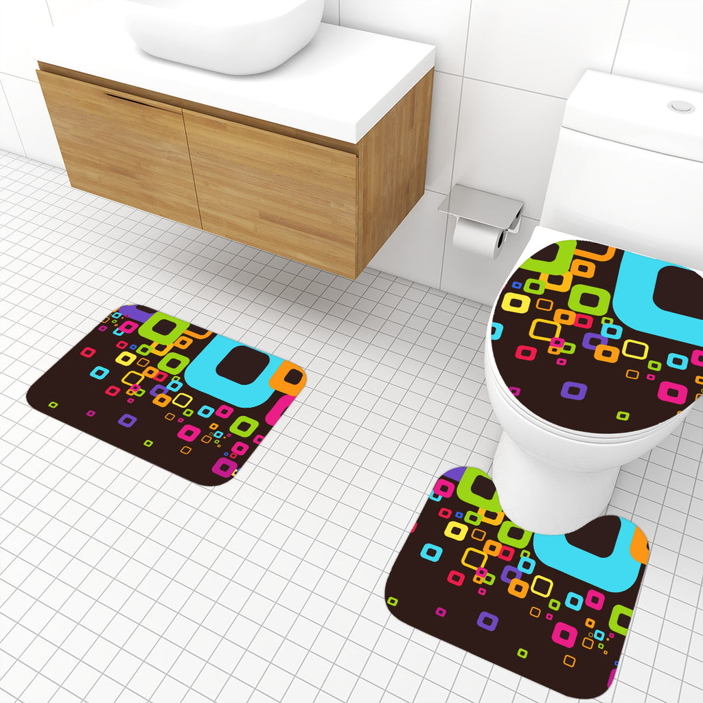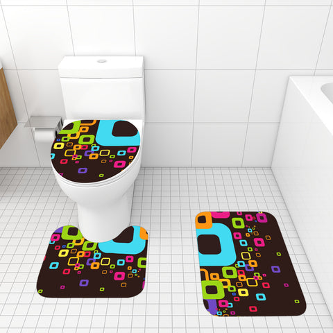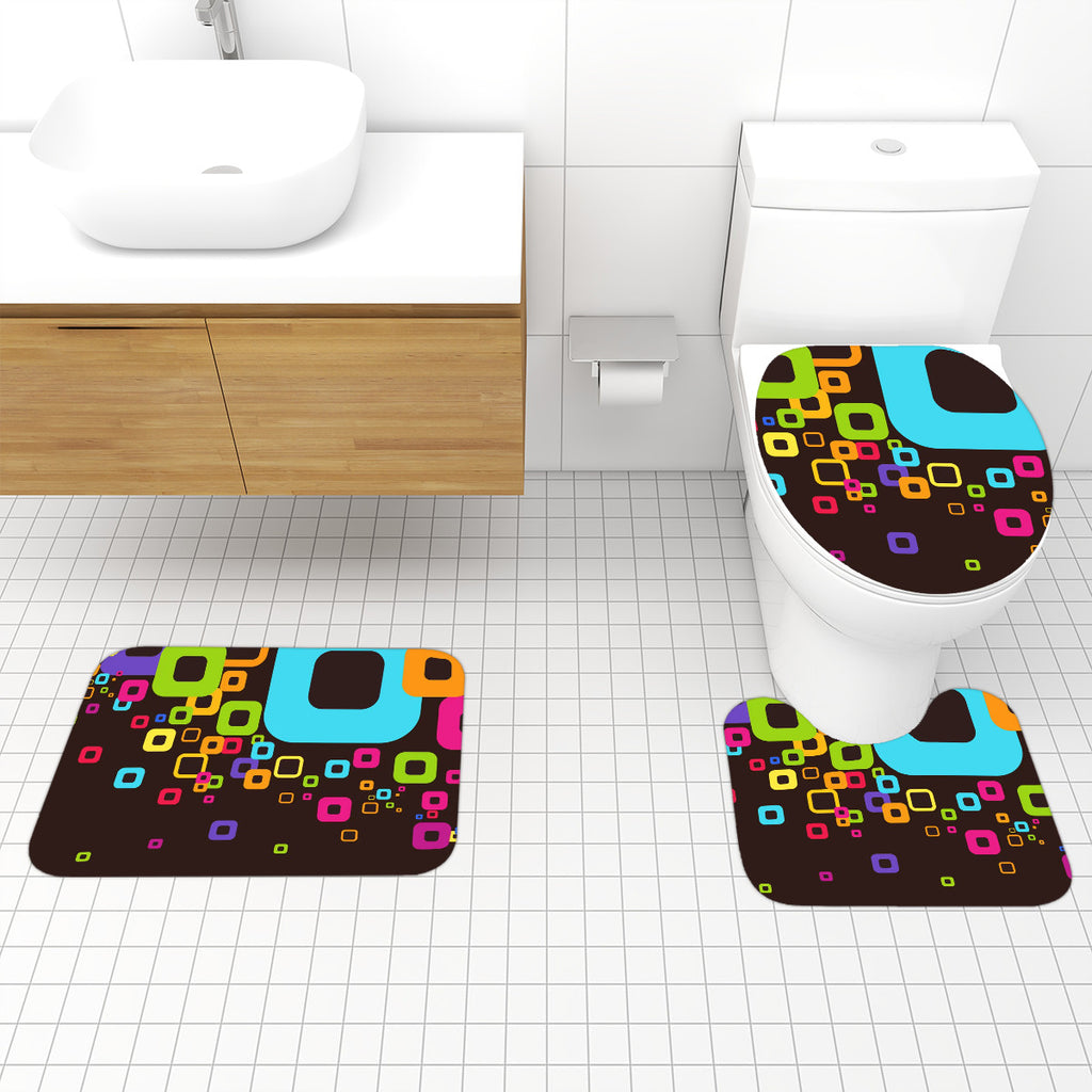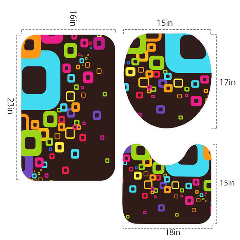 70s Style Bathroom Mat Set | Retro Midcentury 3-Piece Rugs, Geometric Rainbow Colors Black