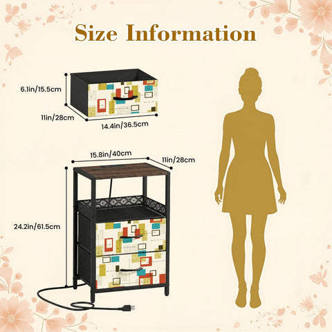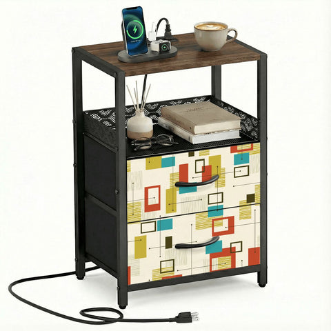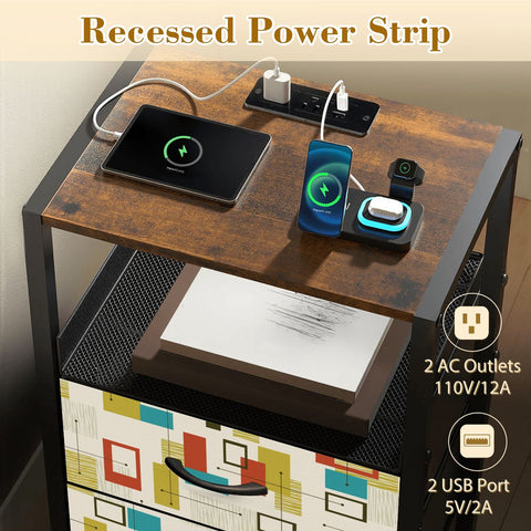 A smart bedside table that blends retro midcentury style with modern convenience. This compact nightstand features two spacious drawers and an integrated power strip built into the top, making it easy to charge phones, lamps, or laptops right where you need them.
