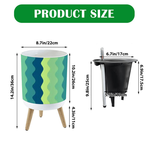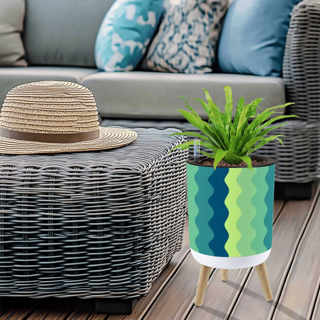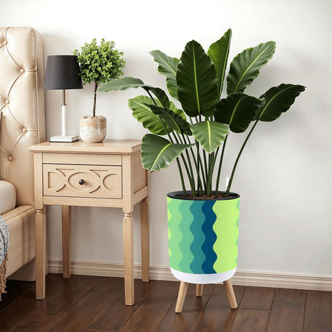 70s Midcentury Scandi Style Plant Pot with Wooden Legs, Wavy Blue Green