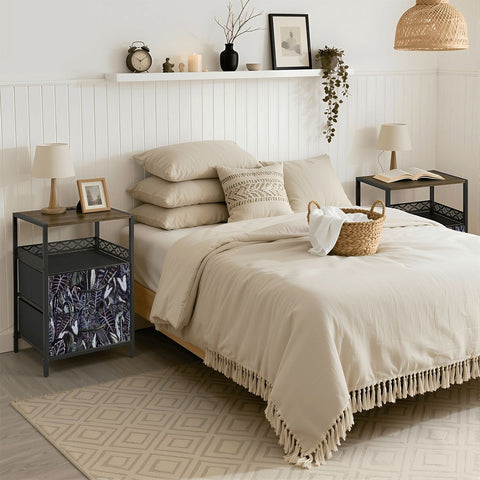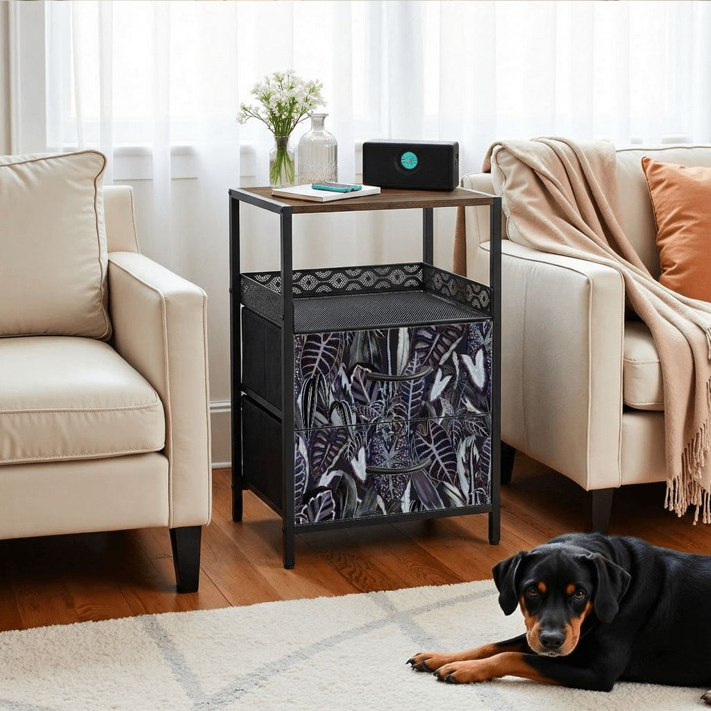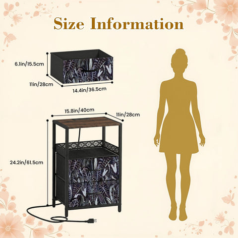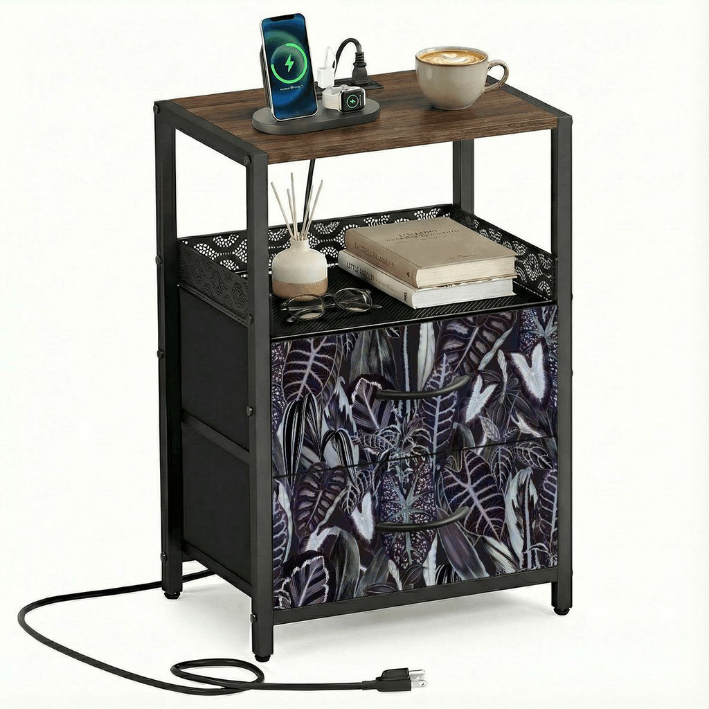 60 Retro Botanical Side Table - Nigtstand With Power Outlets + 2 Drawers