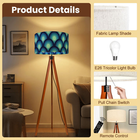 Mid-Century Modern 70s Wooden Tripod Floor Lamp: Retro Peacock Pattern