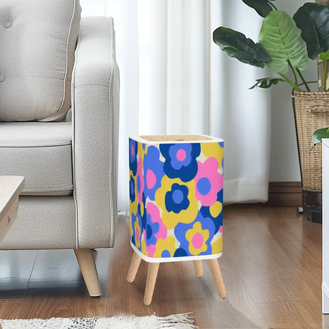 Retro Square Small Trash Can with Lid, 1970s Flowers Blue Pink Yellow
