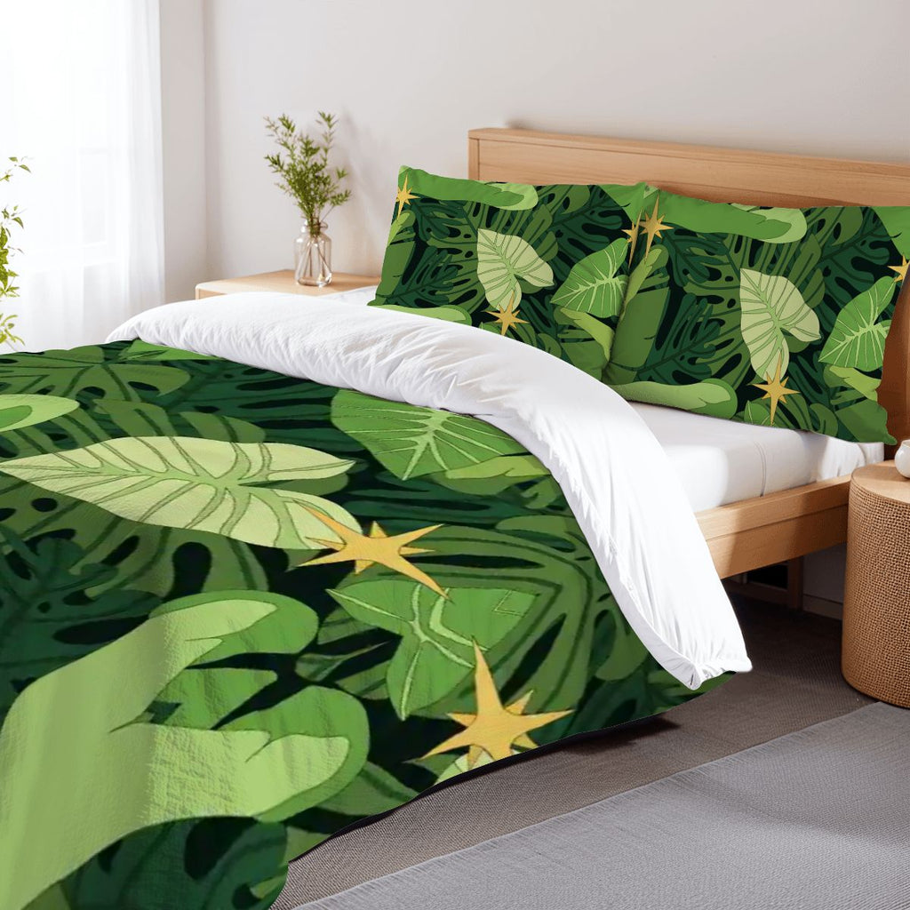 Green Monstera Leaf Retro Duvet Cover Set: Midcentury Botanical Bedding
