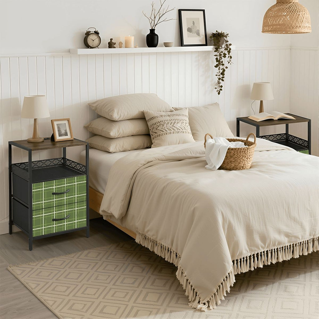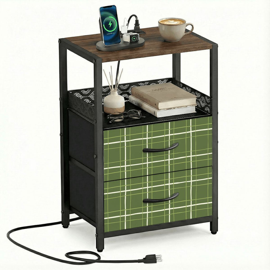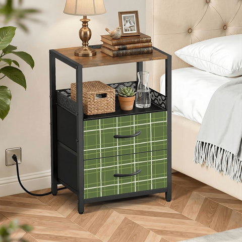 Green Plaid Style Retro 60s Bedside Cabinet with Integrated Power Access