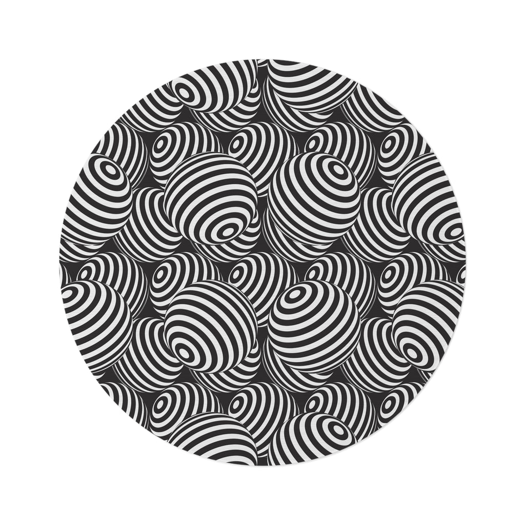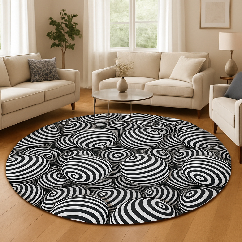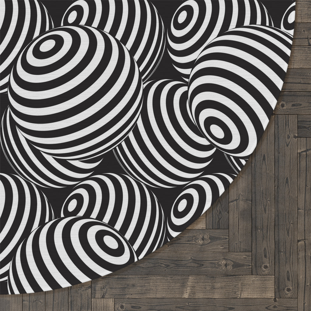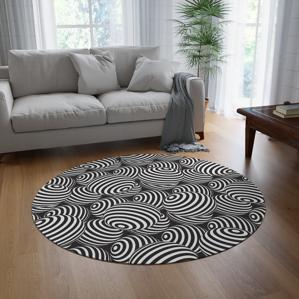 Black White Retro 80s Round Chenille Rug, Monochrome Vintage Style Accent