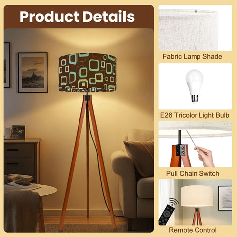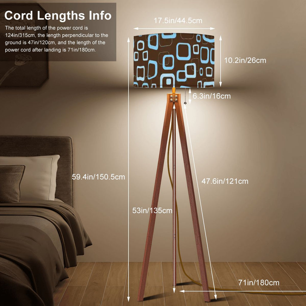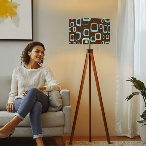 Retro 60s Scandi Tripod Floor Lamp: Brown Blue Pattern Shade, Smart LED Remote